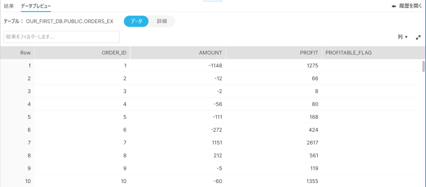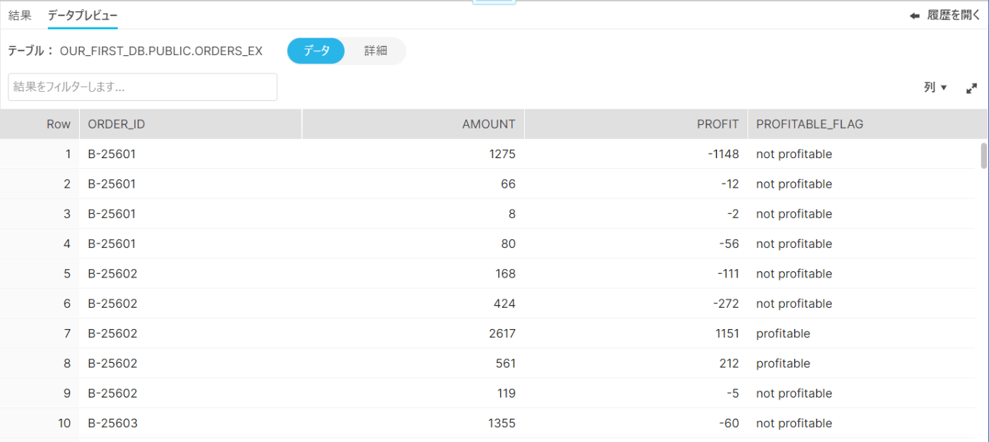 先ほど作成したテーブルORDERS_EXにPROFITABLE_FLAG VARCHAR(30)を追加し、再作成します。