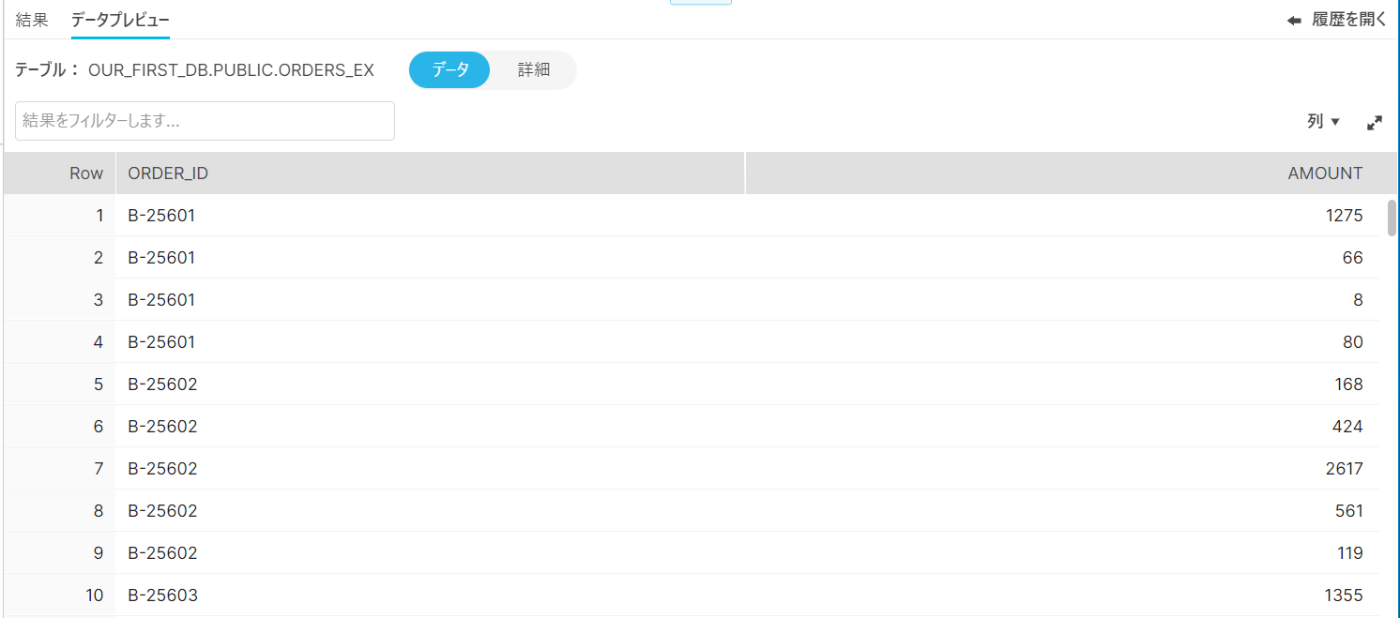 ロードした結果は下記の通り、ORDER_IDとAMOUNTのみロードされている。