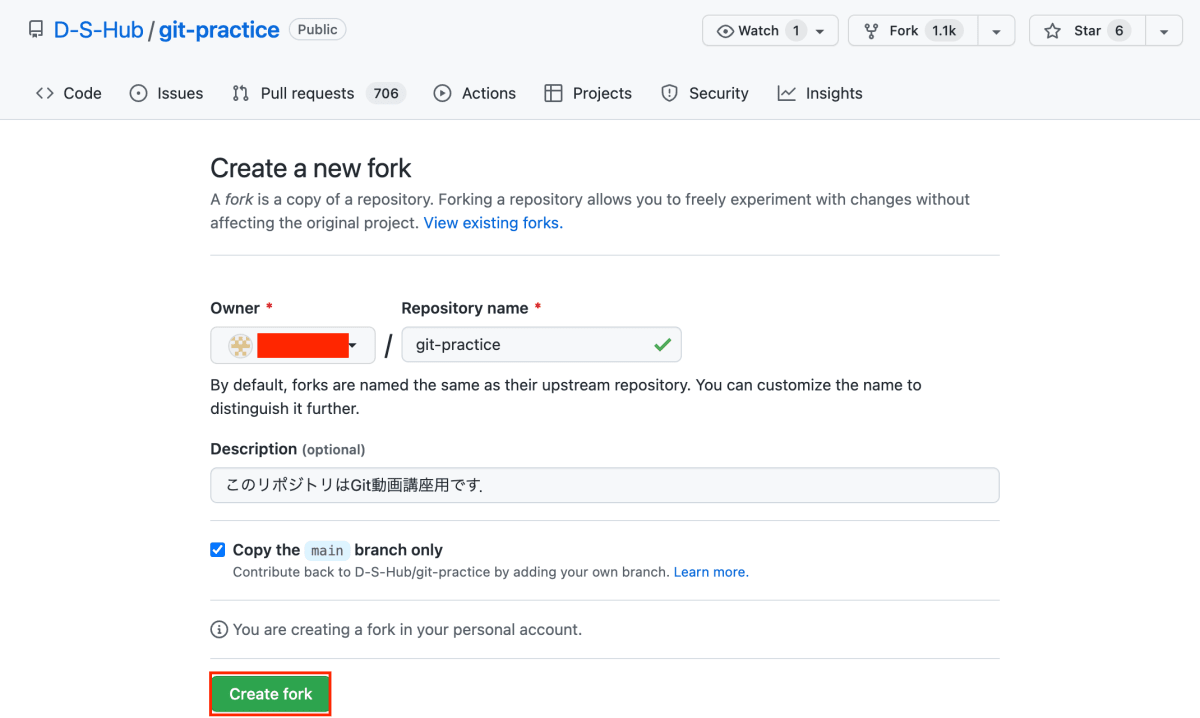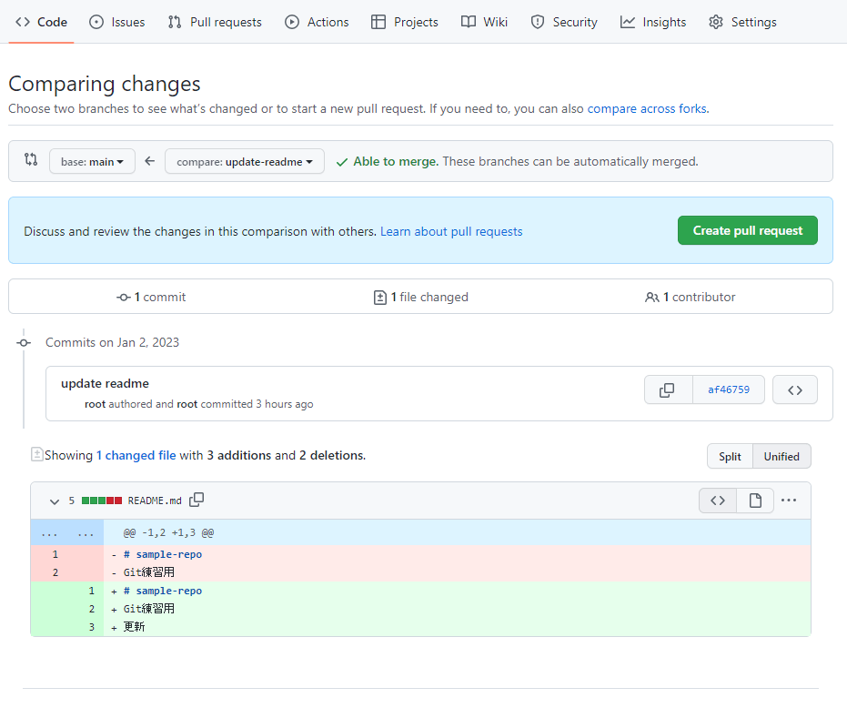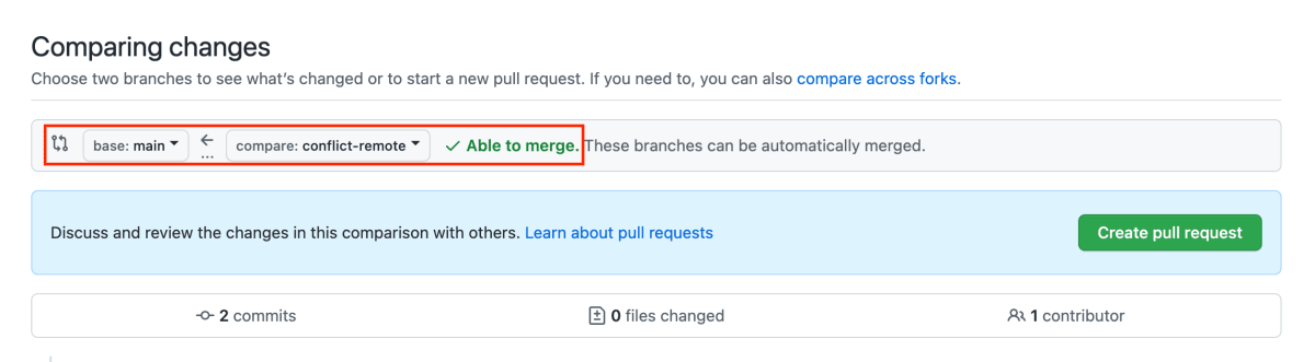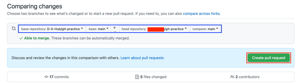 次に「Create pull request」をクリックする前に青枠を見ると、