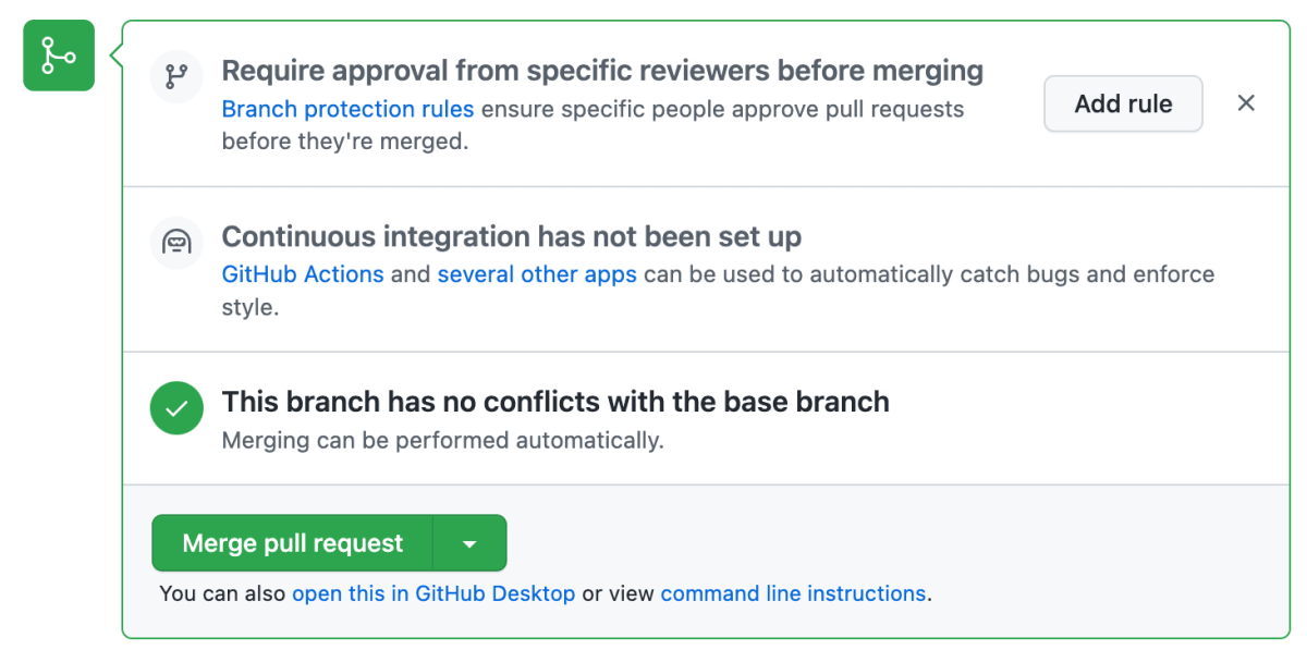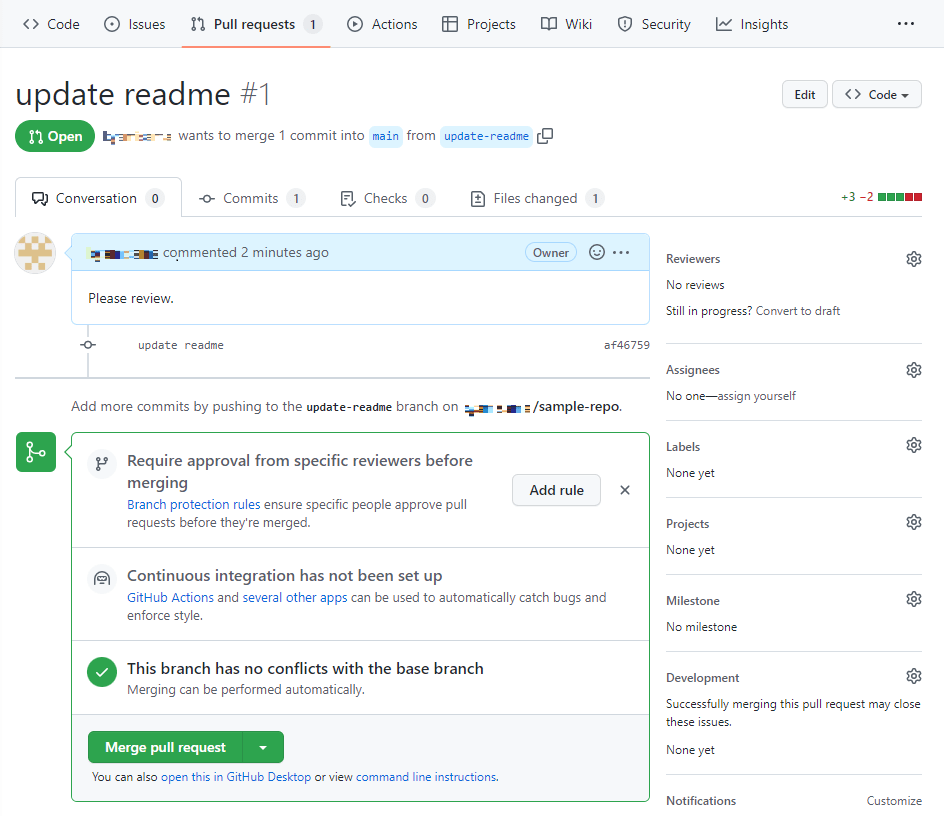 本来は誰かにレビューしてもらって、OKであればレビューした人がマージしますが、今回は自分でマージします。