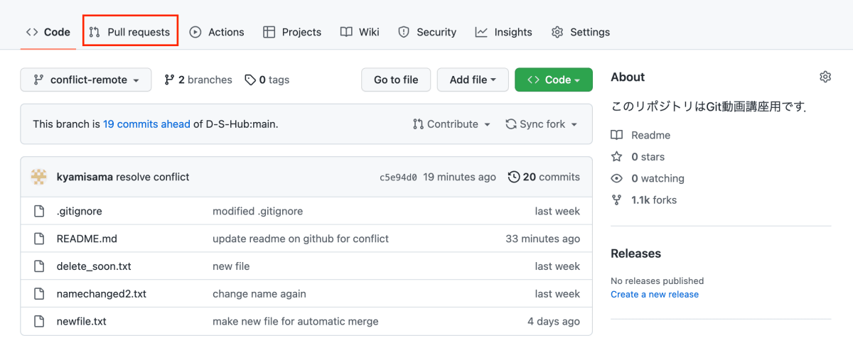 そのため、git pushコマンドでの<branchname>はconflict-remoteを指定しています。