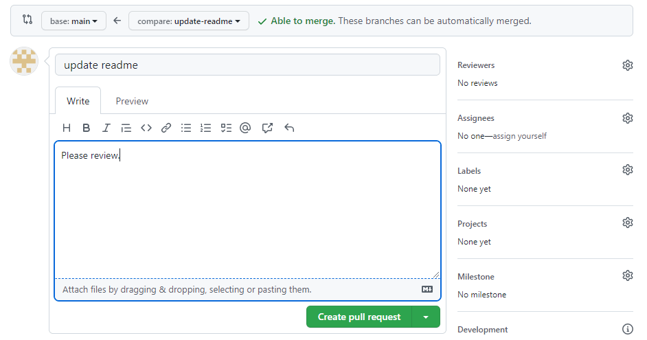 これで「Create pull request」をクリックします。