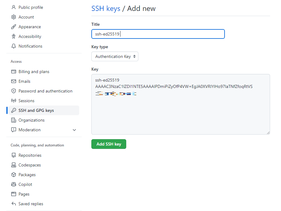 GitHub -> アカウントのSettings -> SSH and GPG keys -> New SSH key をクリックする
