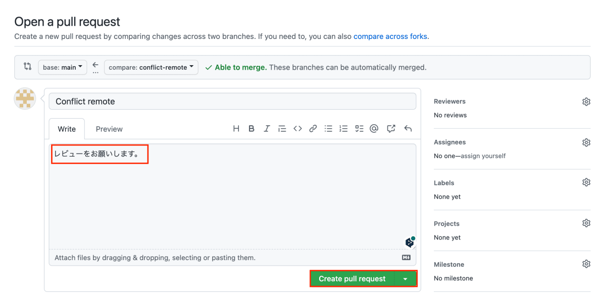 次にプルリクのコメントを記入し、もう一度「Create pull request」をクリックします。