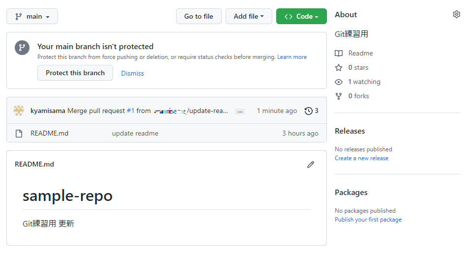 今回はmainブランチで作業を無しにしたいので以下のように修正しました。