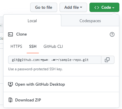 GitHubにアクセスし、<>Codeボタンをクリックし、SSHのURLをコピーします。