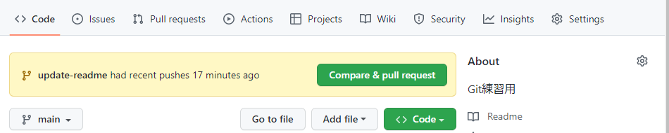 今回はmainブランチにpushするのではなく、リモートリポ上にconflict-remoteブランチを作成します。