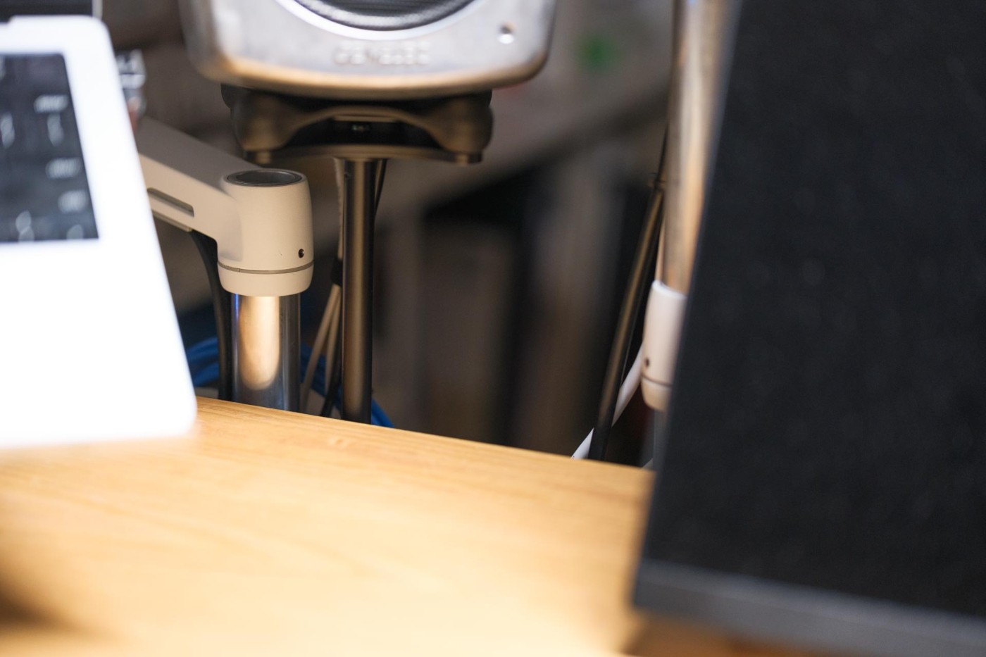スピーカースタンドも同様に考えることができます。コンテンツ制作用のモニタスピーカーには、 iLoud Micro Monitor や Genelec 8x3x のように、UNC 3/8-16のネジでマイクスタンドに取付けられるようになっている機種もあります。この場合は、マイクスタンドの先端部分だけを高さ調節のできる形で机に取付ければ足ります。今回はK&M 20004を使用しました。