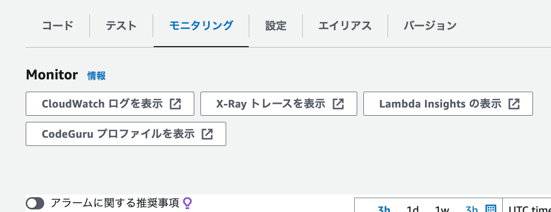 Lambdaのコンソール画面に入り、写真の「CloudWatchログを表示」ボタンを押下すると、Lambdaのログを見ることができます。そこからエラー原因を調査してみてください。