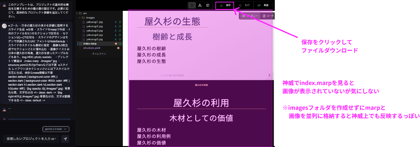 index.marpをクリックすると生成されたmarpが確認できます。画像がmarpに反映されていなくても気にしないでOKなので保存を押してデータをダウンロードします