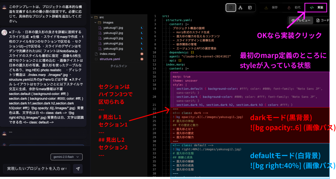 ・スライドの依頼なのにセクション区切りにmarp記法の ---で区切られていない(ただし背景黒で—が目立たないこともある)
