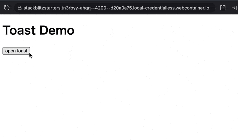 トーストとして表示されるビューをToastContainerコンポーネントとし、素朴にCDK Overlayを使うと次のようなコードになる。動的に生成したコンポーネントはそれを破棄するのも開発者の責任である。overlay.dispose() を呼び出すことでオーバーレイとその上に表示されていたコンポーネントがすべて破棄される。これでトーストが一定時間後に消えるようになった。