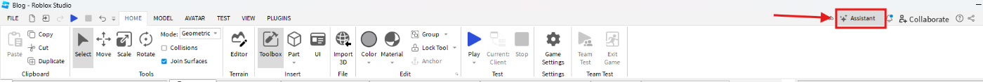Roblox Studioではメニューバーの上部にあるアシスタントボタンを押すことで、アシスタントのウィンドウを開くことができます。