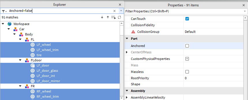 Carの子孫 且つ Anchored=false 且つ CanCollide=true