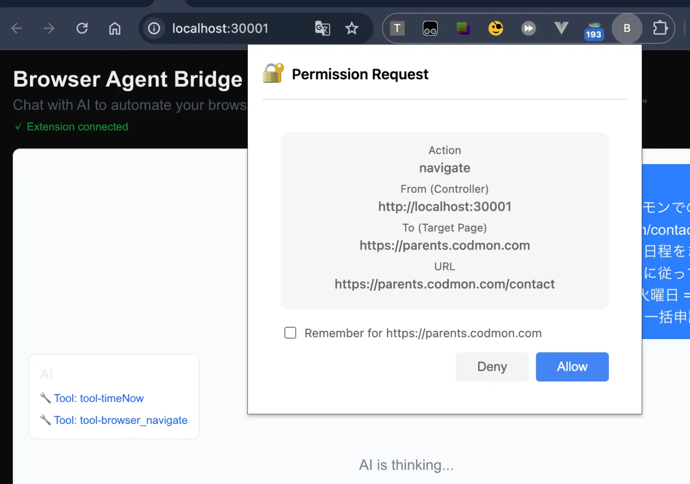 予期しないWebアプリや、予期しないタイミングで操作を開始されるリスクがあります。Agentがブラウザ操作のtoolを呼び出すと、ユーザーに許可を求める形としました。