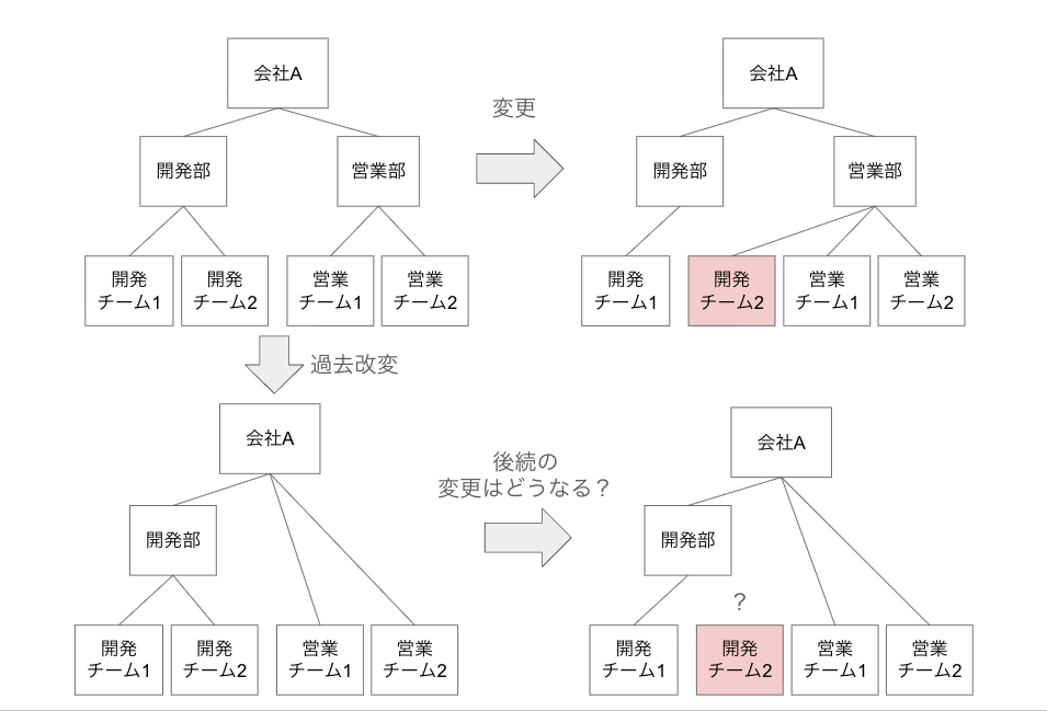 他にも、たとえば親部署が別部署以下に過去改変で更新されるなど、後続処理を適用した結果、最終的に想定していなかった部署の下についてしまうようなケースがありえます。