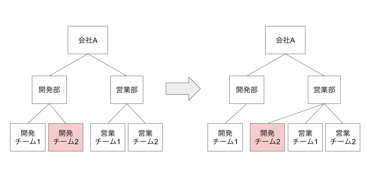 「開発チームを一つ営業部直下においた方が事業のレバーが効くな!」などの意思決定があり、構成が変更されたとします。