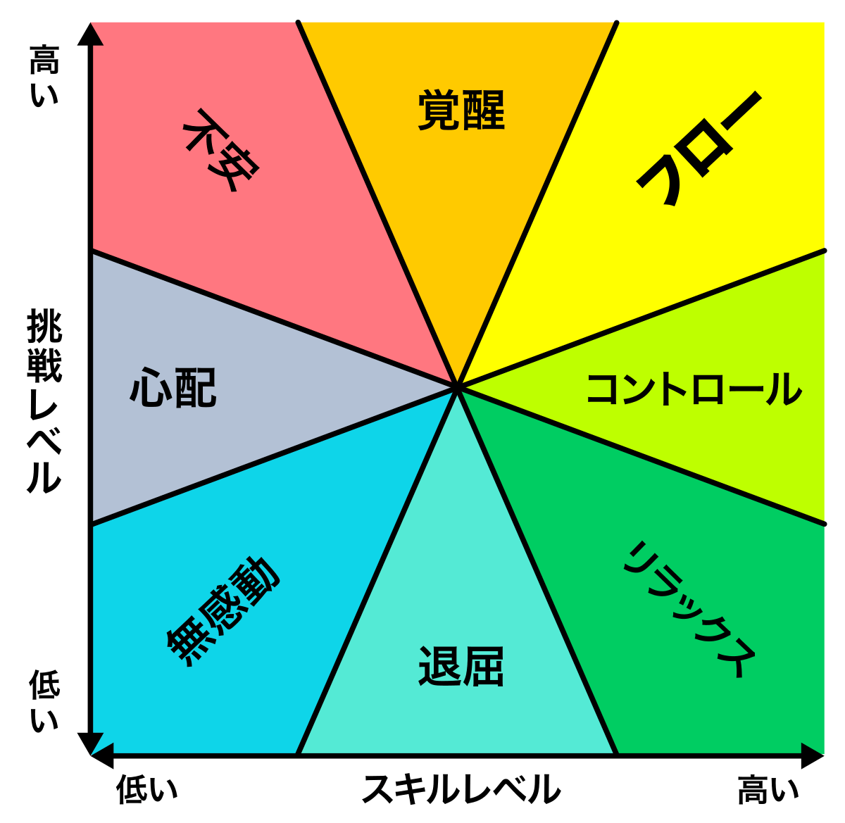 スキルと挑戦が高いレベルで釣り合った、グラフ左上のフロー状態が最もパフォーマンスが高くなります。