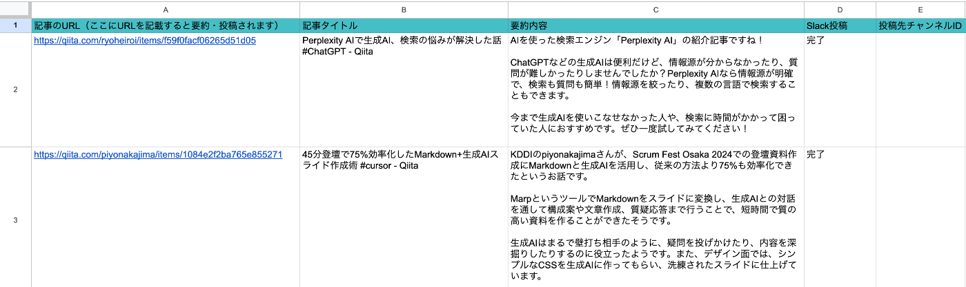作成したスプレッドシートにもページURLやタイトル、要約文章が自動で追加されます。