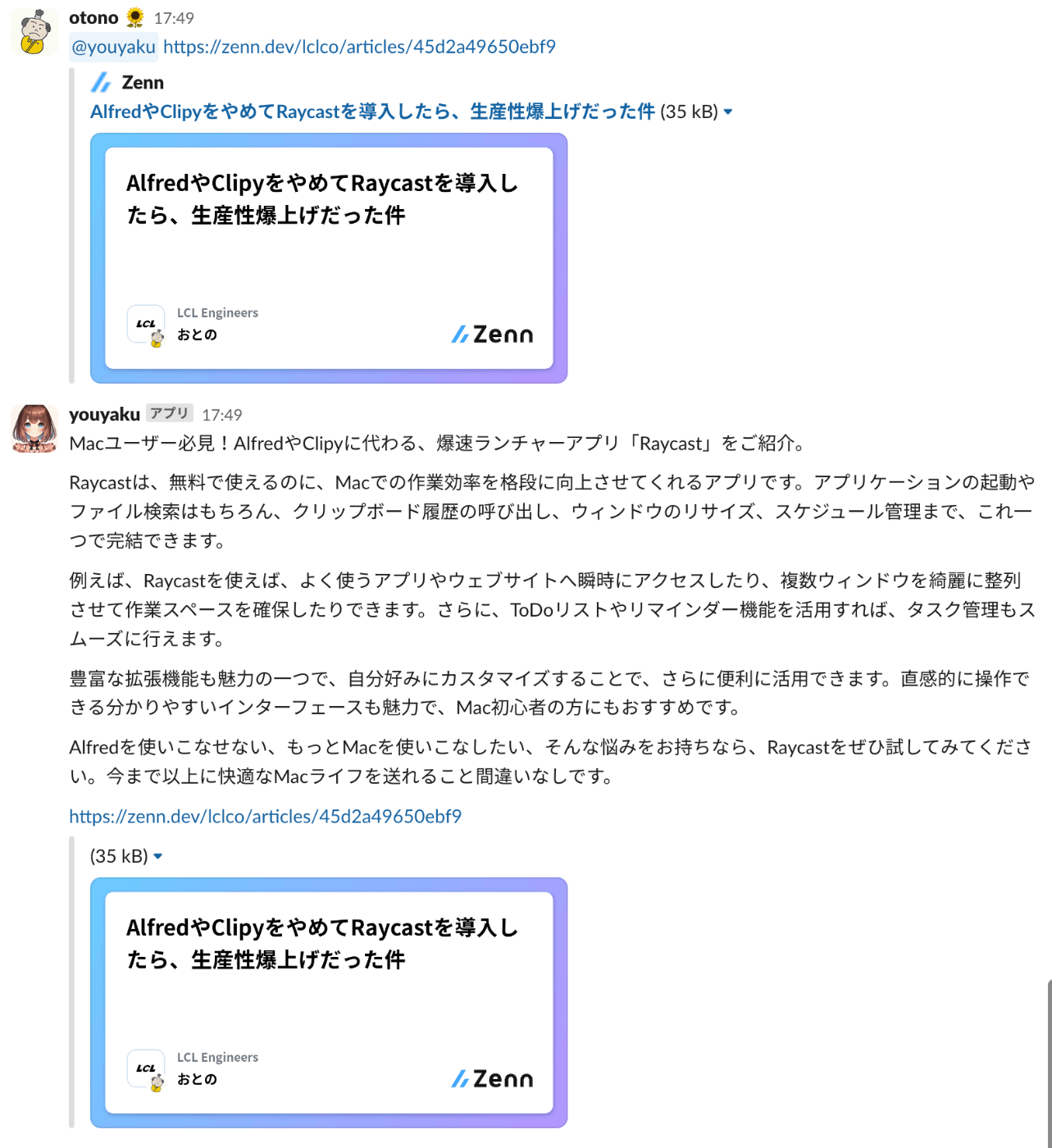 そこで、今回作成したのが、URLを指定するだけで記事の要約をSlackに投稿できるBotです。