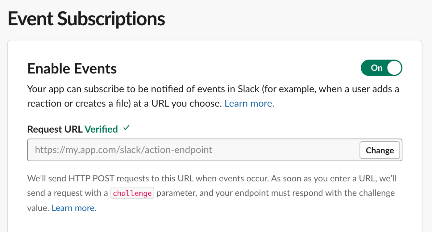 Slack AppのEvent Subscriptionsに、デプロイしたアプリケーションのURLを設定します。