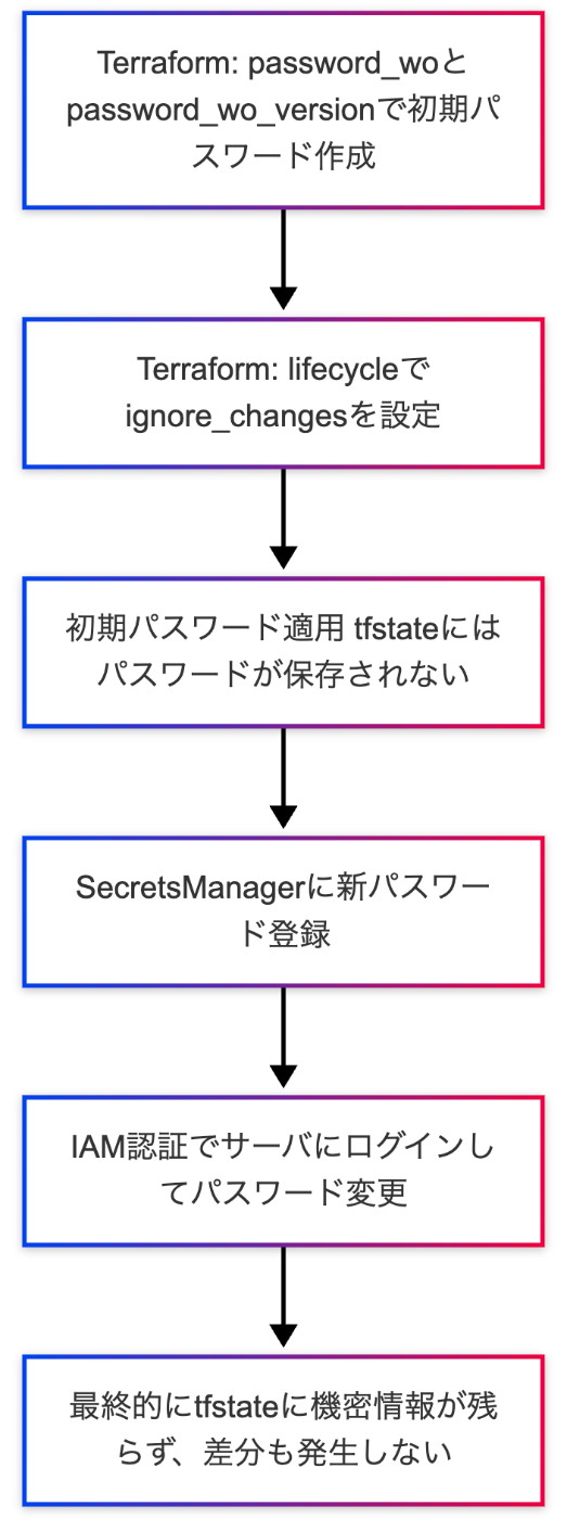 RDSの初回作成時に一時的なパスワードを渡し、Terraformの状態に機密情報が残らないようにし、その後は外部のシークレット管理システム(AWSSecretsManager)で運用するケースがまずは思い浮かびます。