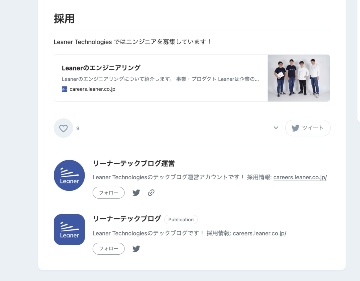 各自アカウントから Publication への投稿ができるようになったわけですが、直近では今まで通り @leaner_tech からの投稿をメインに運用する予定です。