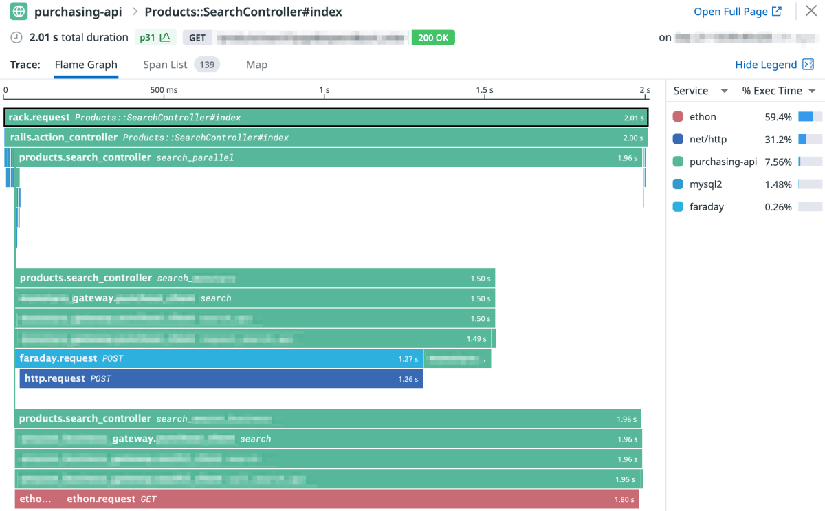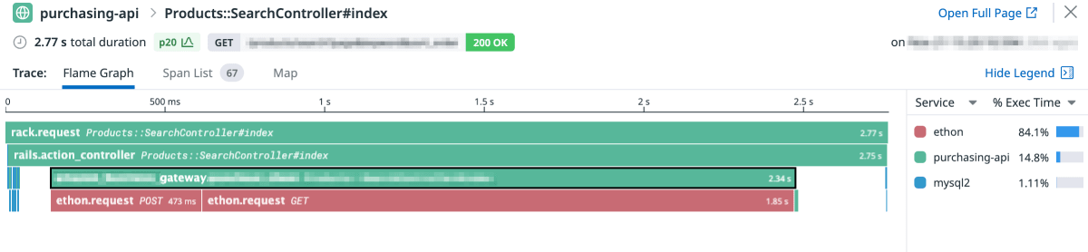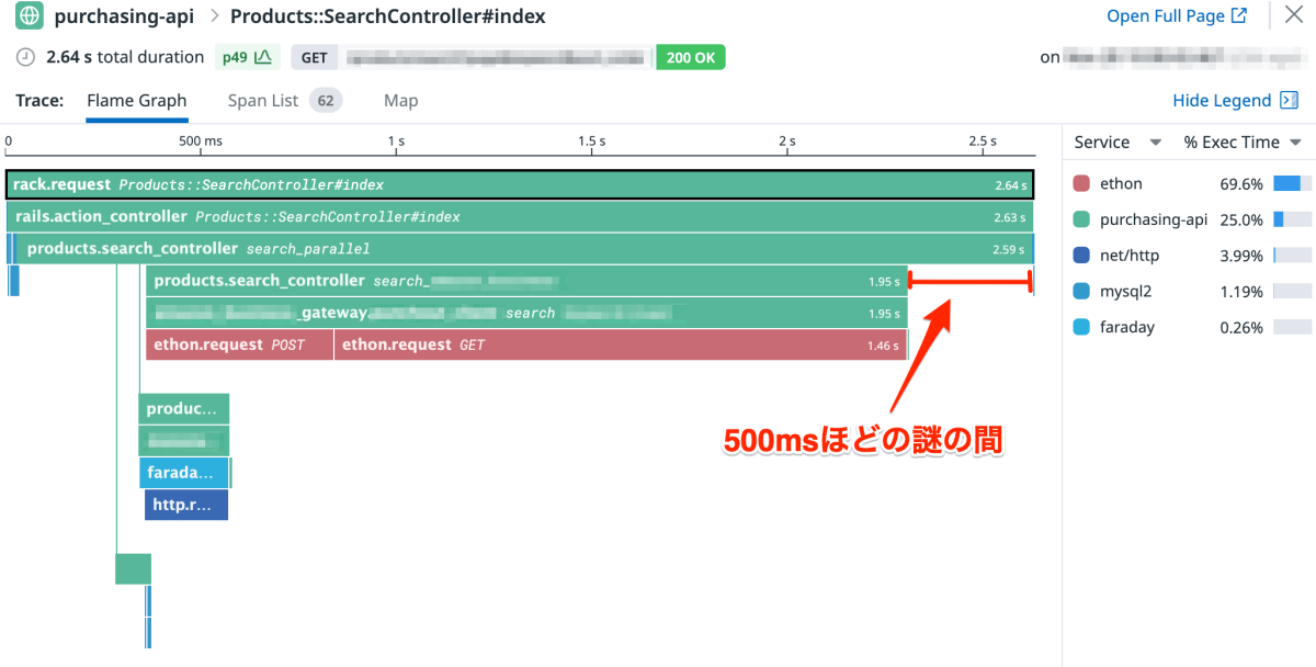 外部 API リクエストを並列して処理できるよう、コントローラーでは上記のように各 Gateway の search メソッドを呼び出していました。この際、 Datadog の実行コンテキスト情報がプロセス間でうまく共有されておらず、子プロセスでのスパンを親プロセスのスパンと紐付けられていないのではないかと推測しました。