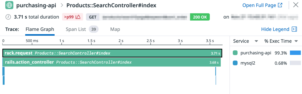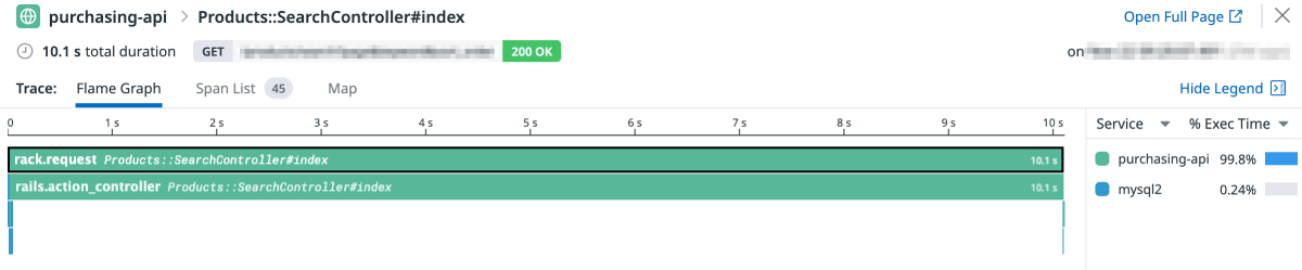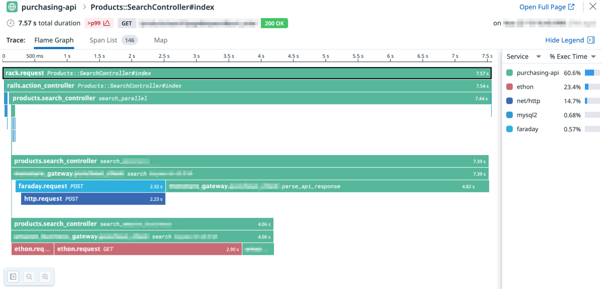 以下の図は ddtrace gem 導入直後に取得した、商品検索 API のトレース情報です。