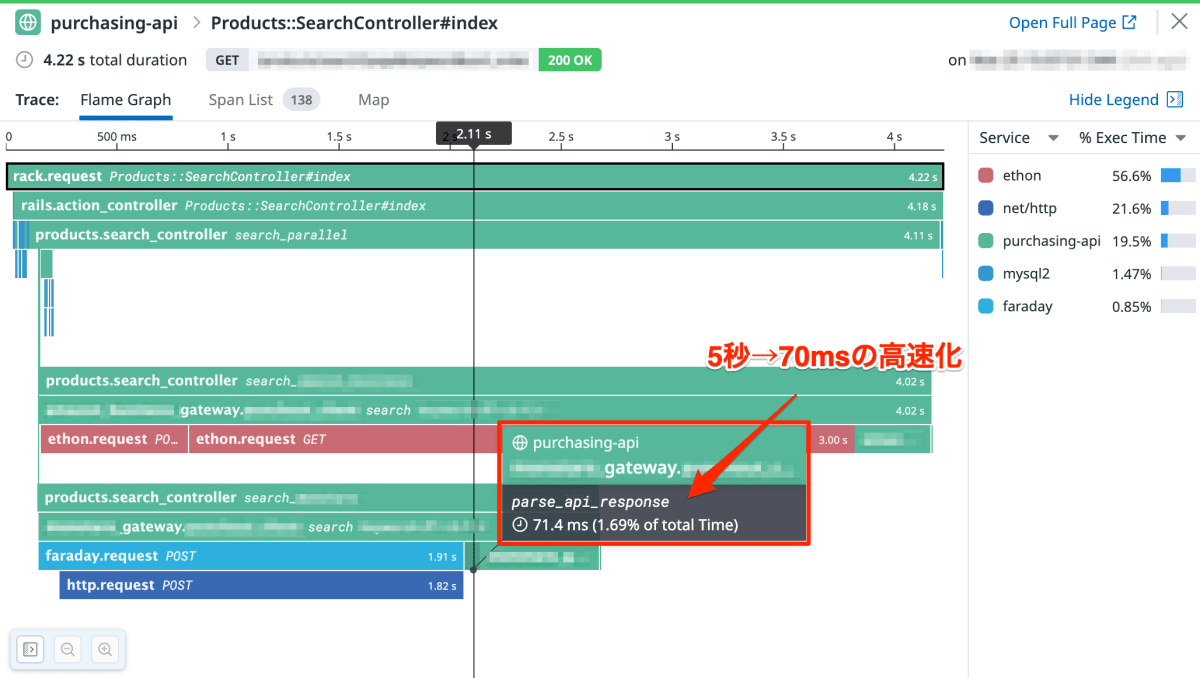 幅が短くなりすぎてタイムライン上で分かりづらいですが、もともと 5 秒ほどかかっていた parse_api_response