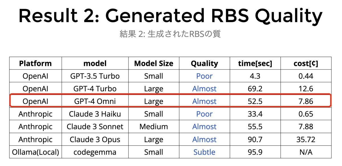 この手法ではベースとなる RBS の生成手法と、推論に利用する LLM のモデルとで、多くの組み合わせが存在します。