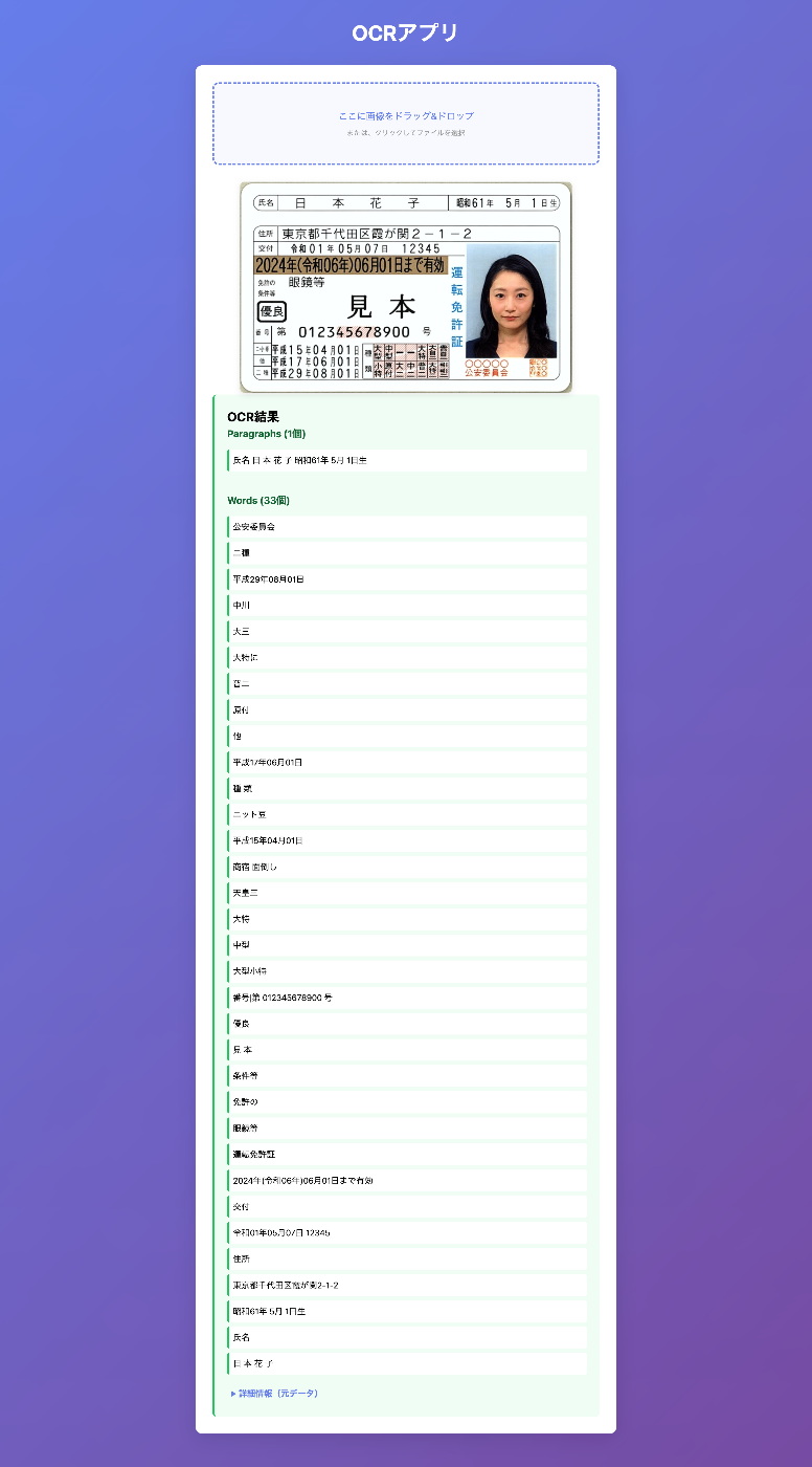 詳細情報セクションを開くと、yomitoku が返した生のデータを JSON 形式で確認できます。位置情報(bounding box)なども含まれています。