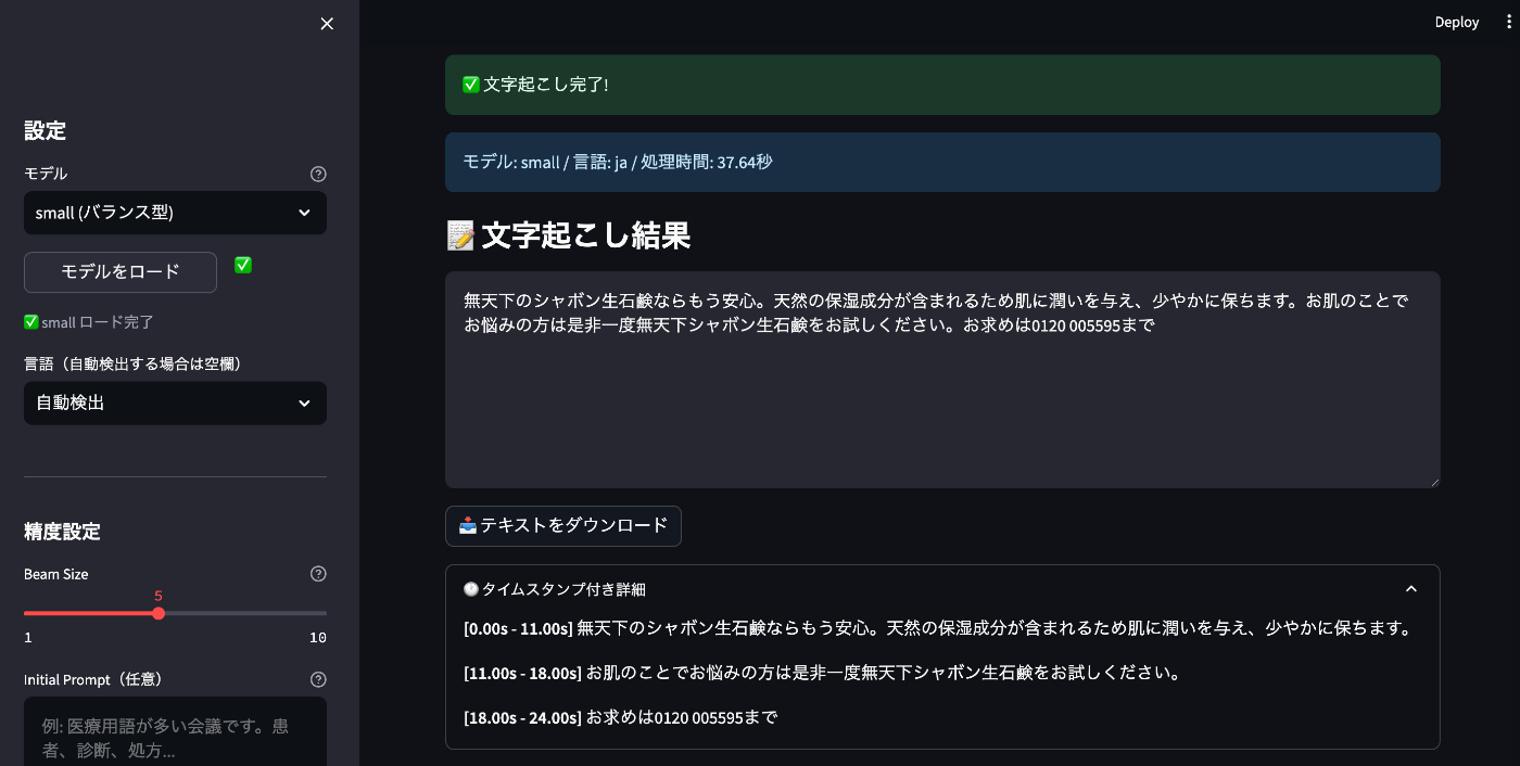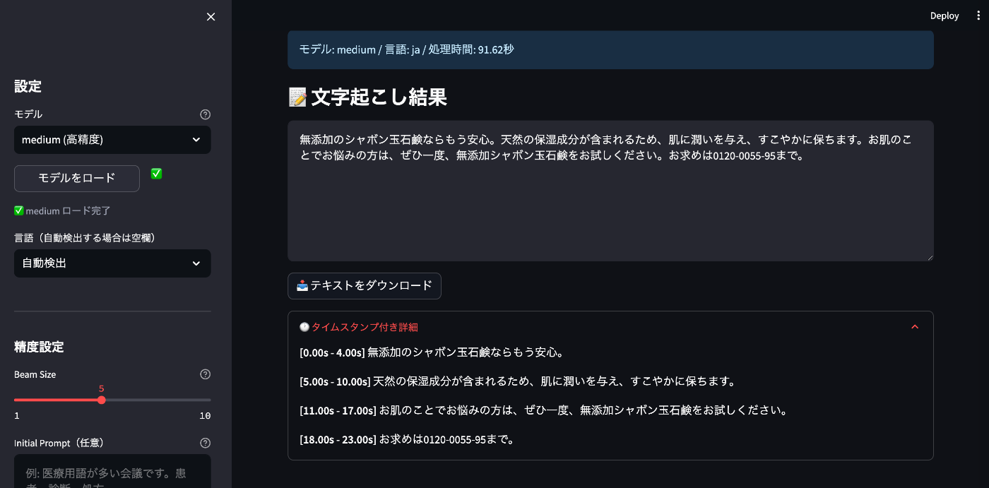 精度重視なら medium 以上がおすすめです。今回のテストでは、medium モデルが「無添加のシャボン玉石鹸」「0120-0055-95」と正確に認識し、句読点の位置も自然でした。