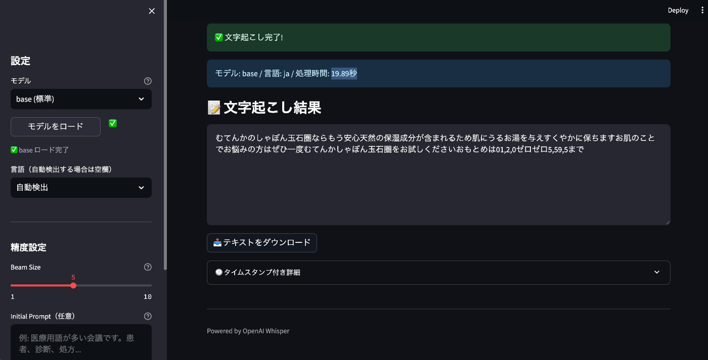 | tiny | 11.55秒 | 誤認識が多く実用は厳しい(「社本名ませっけん」など) |