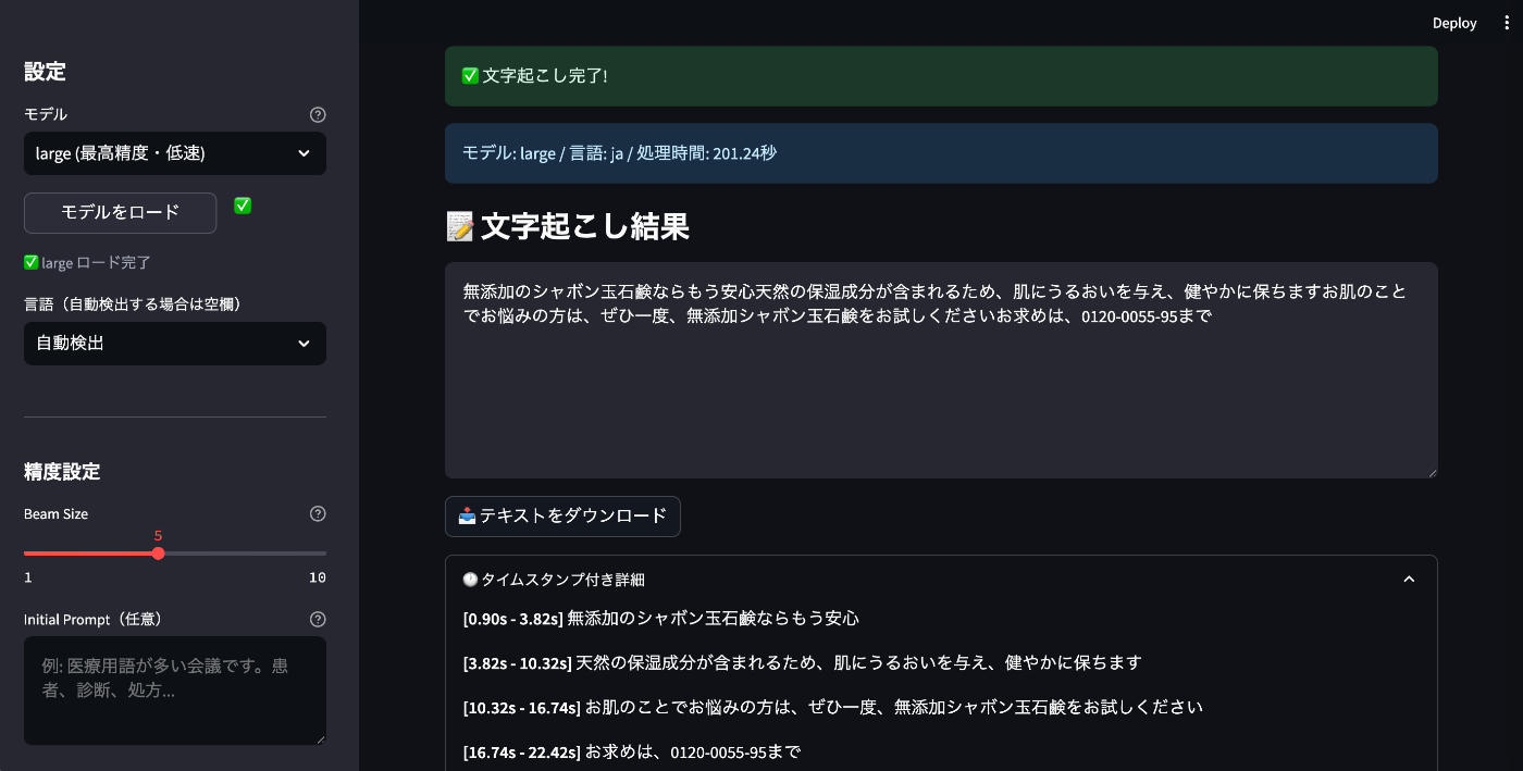 | large | 201.24秒 | mediumと同等の精度。句読点がやや少ない |