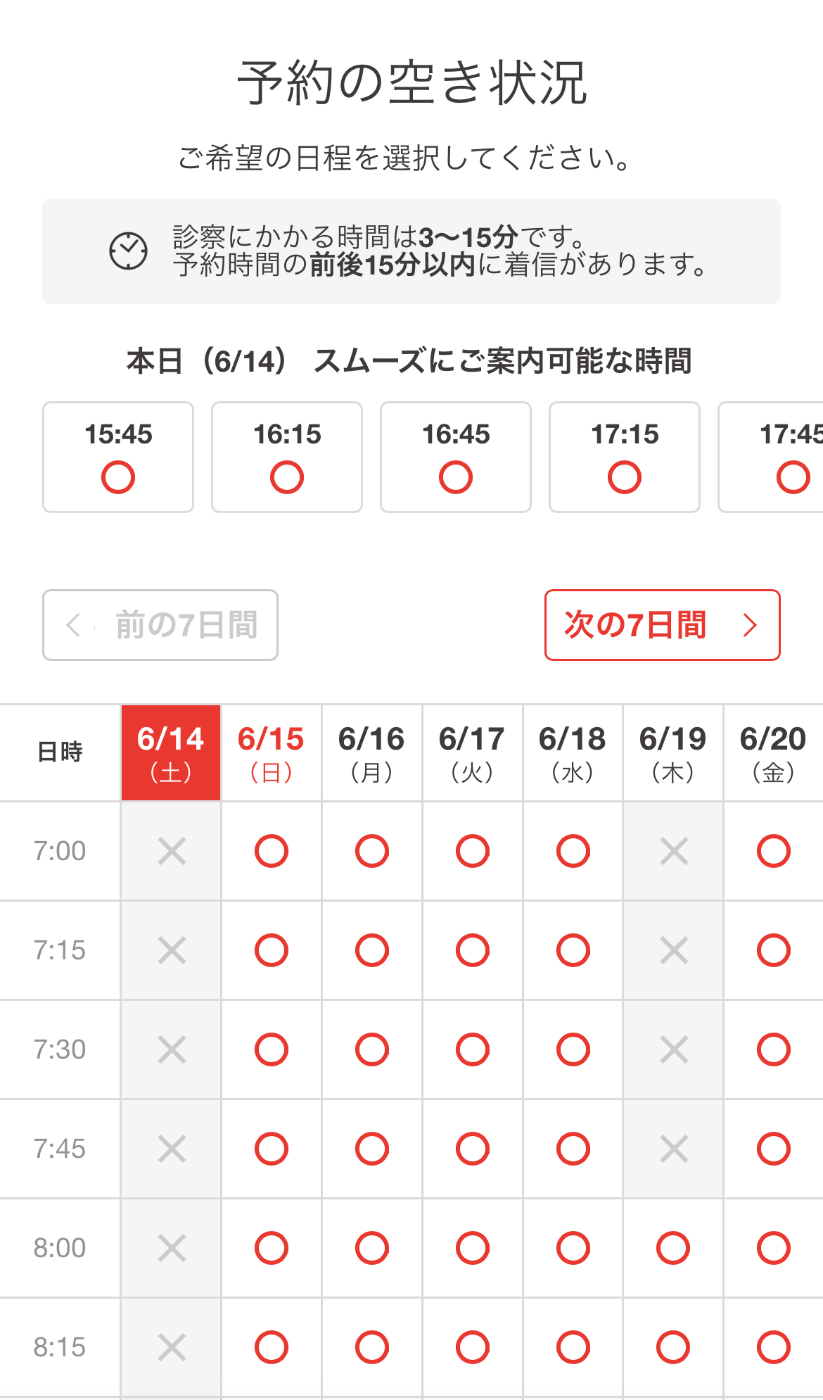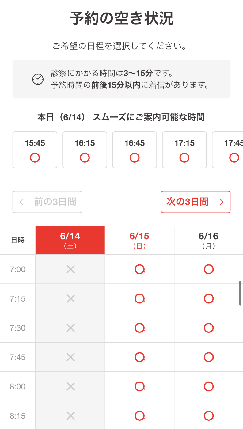 診療科のランディングページ(LP)に載っているカレンダーから予約が可能なのですが、現在はファーストビューで3日間表示されます。これを7日間表示に変更するという施策が走りました。以下がその画面です。