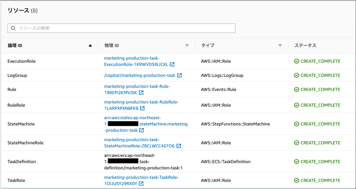 ServiceではECSサービスが作成されていたのに対して、JobではEventBridgeとStep functionsのリソースが作成されています。