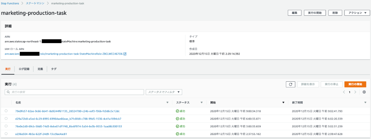 しばらく時間を置いてStep functionsのコンソールを見ると、ステートマシンが3時間置きに実行されていることがわかりました。(確認のため初回だけ手動実行してしまいました)