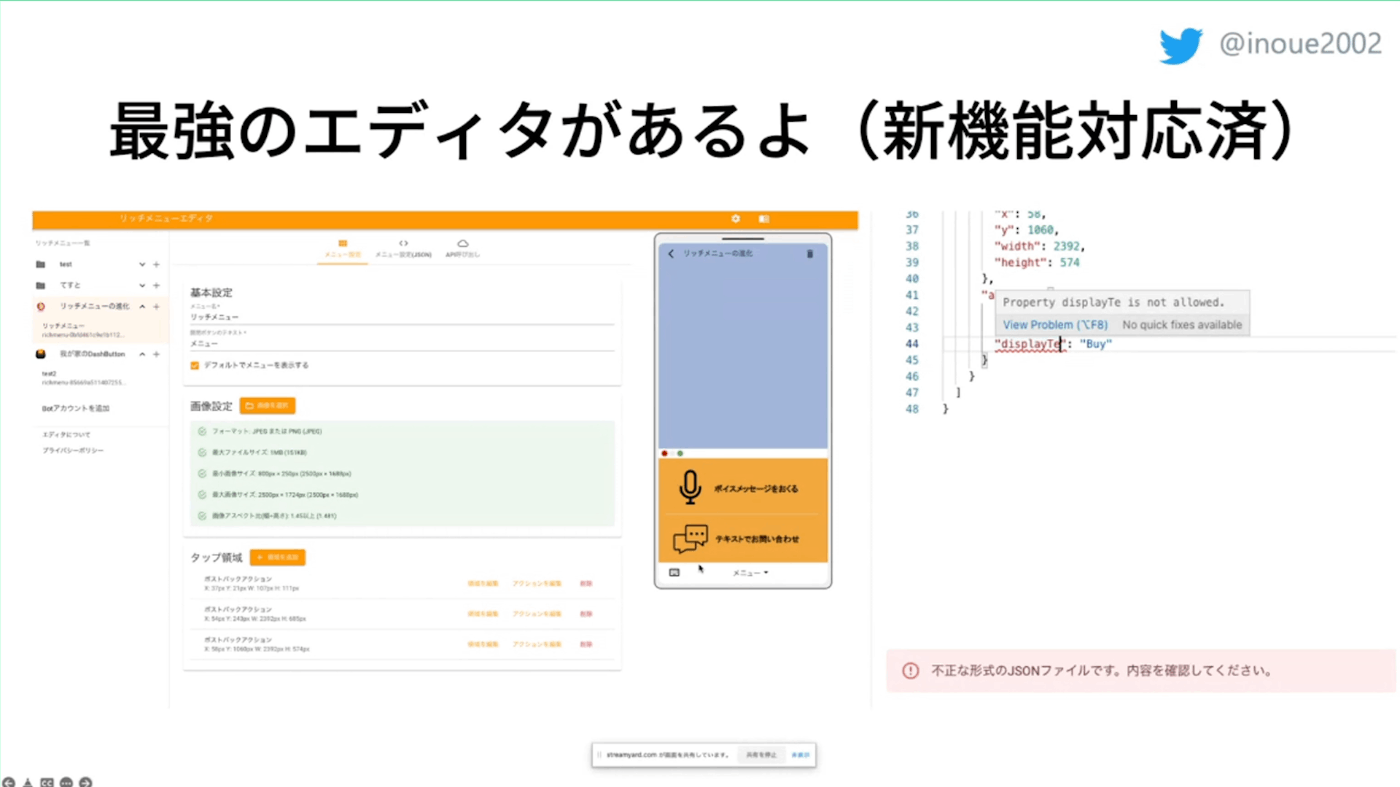 他にも最強のエディターがあるよってことで、友達が作ってるリッチメニューのエディター紹介します。これ便利で設定もGUIでできてJSONオブジェクトのリンターもちゃんと走って、不正なファイルだよって言ってくれたりとか、あのポジションをこんな風に自分の手で範囲を指定して登録できて、全部できちゃうみたいなやつがあるんですよね。最近の新機能にも今回も対応してあるのですごい便利です。