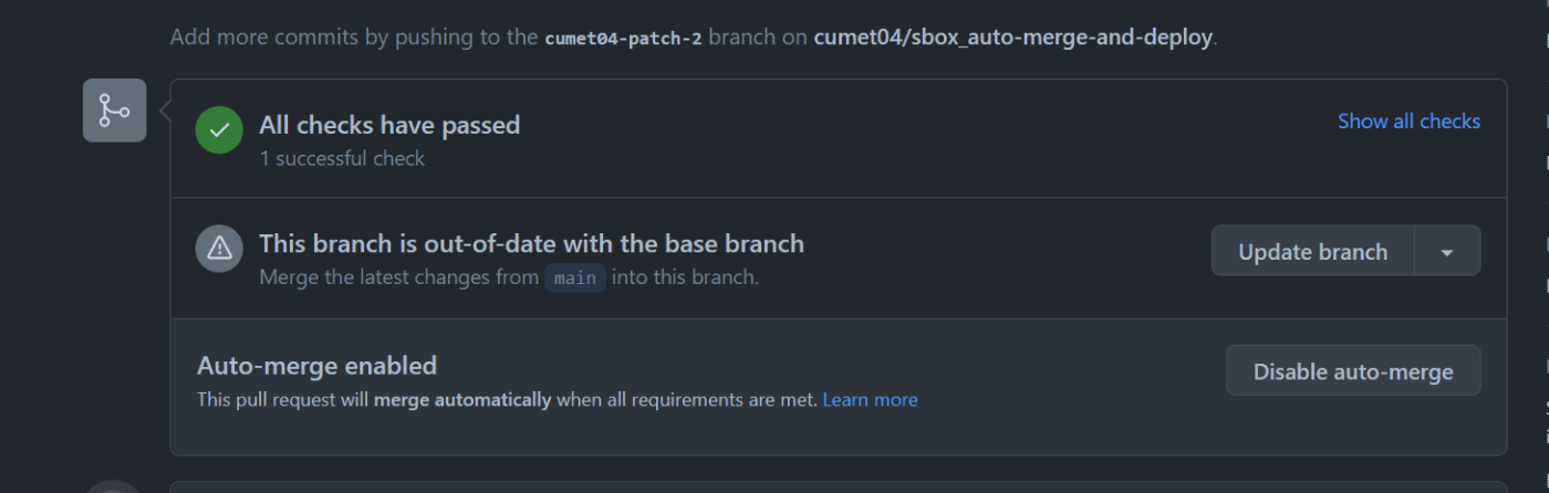 とはいえ別に待ちが発生するわけではないので、Enable auto-mergeをポチった後に流れるようにUpdate branchもポチればok。