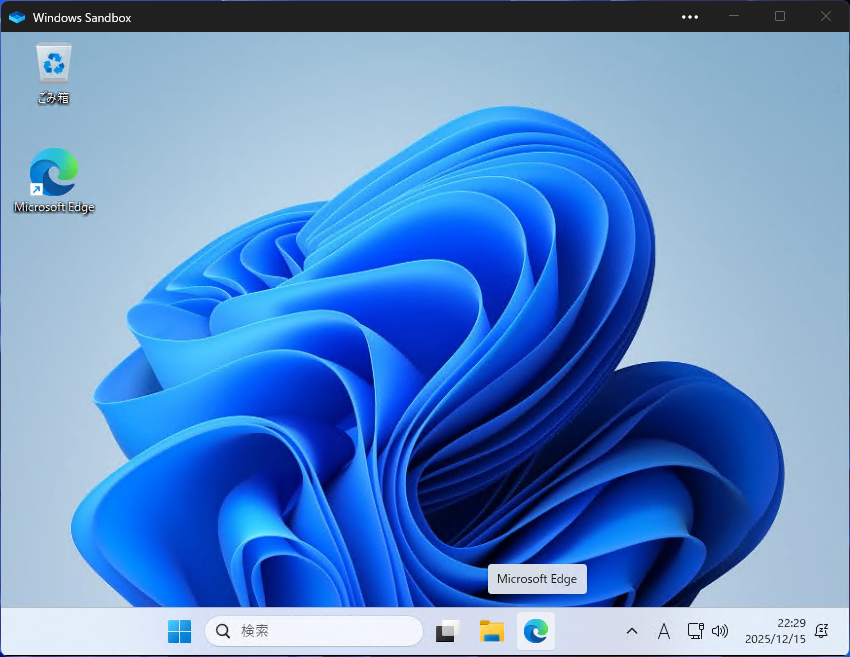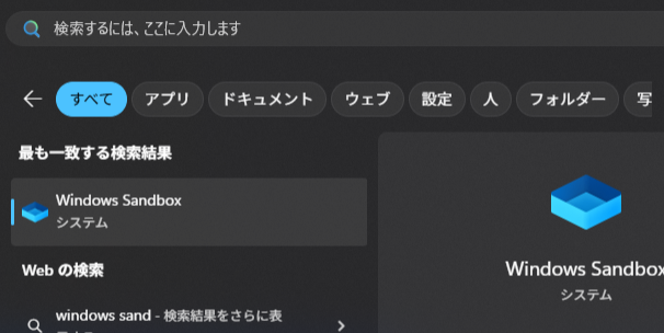 スタートメニューから「Windows Sandbox」と検索して起動します。