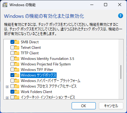 Windows Sandbox機能はデフォルト「オフ」のため、