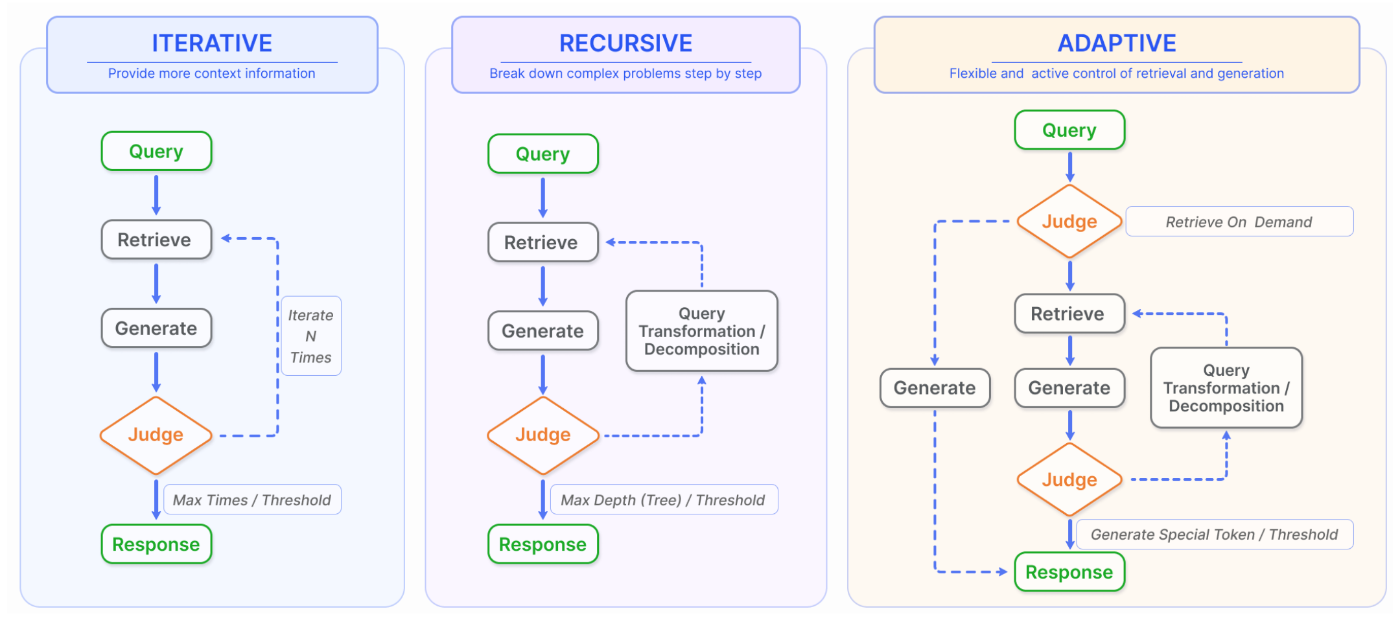 Gao et al. の Fig.5 は、その代表的な 3 パターンを Iterative / Recursive / Adaptive Retrieval としてまとめています。
