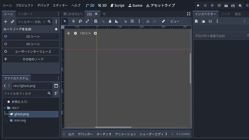 AnimationPlayerを追加すると、下にアニメーション編集画面があらわれます。