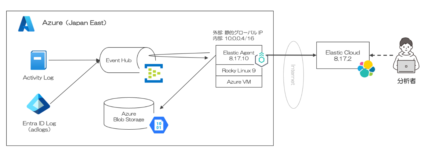 Azure で取得できる監査ログを Elastic Agent [1] で Elastic Cloud に取り込み、そのログを Kibana で分析できるようにします。