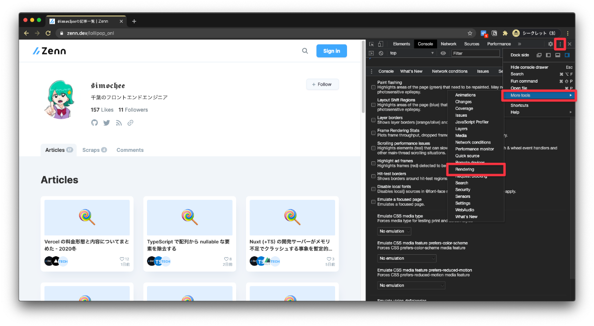 Chrome DevTools の Rendering タブは メニュー(三点ドット)→ More tools → Rendering から表示できます。