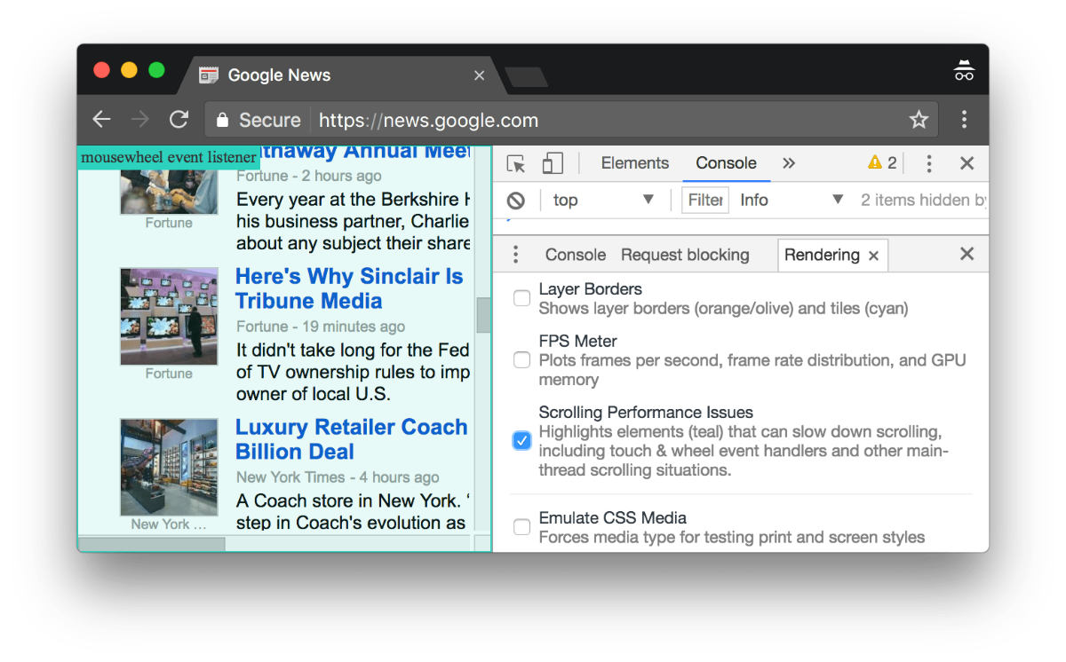 タッチやホイール、その他のメインスレッドでの処理からスクロールを遅延させる可能性がある要素を青緑でハイライトします。