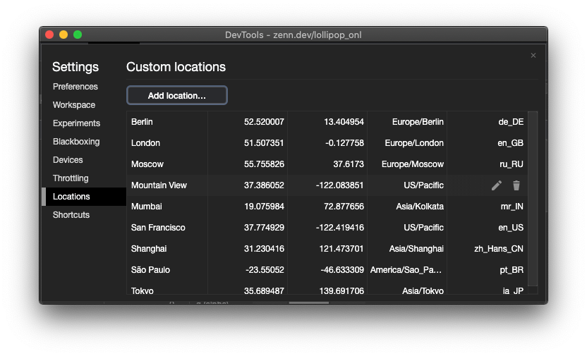 ブラウザがアプリケーションに提供する位置情報やタイムゾーン、言語をオーバーライドします。