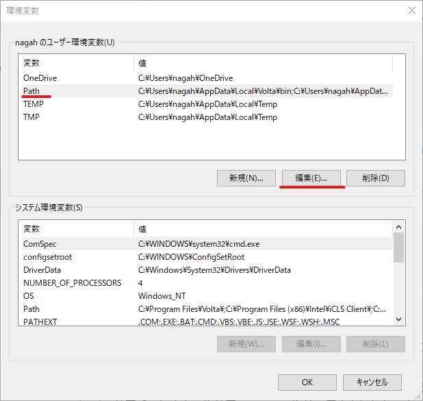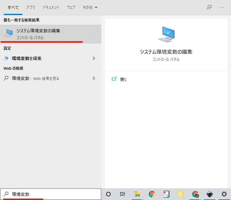 検索ボックスに「環境変数」と入力し、「システム環境変数の編集」をクリック