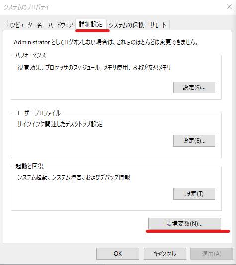 「詳細設定」タブ「環境変数」ボタンをクリックします。